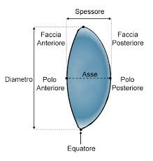 La faccia anteriore del cristallino è un segmento di sfera con un raggio di curvatura di 9 mm, ed è separata dalla cornea da 2/2,5 mm. Ha un peso di 250mg e un peso specifico di 1,079. E’ una lente biconvessa con convessità maggiore sulla faccia posteriore, la quale soprattutto nei giovani è in diretto contatto col corpo vitreo, ed è presente soprattutto nei giovani un legamento che è quello dello Zinn, che fa aderire la ialoide direttamente sulla faccia posteriore del cristallino. Questo rapporto è importante soprattutto a livello chirurgico, perchè bisogna cambiare tecnica se si opera un bambino oppure se si opera un anziano, in quanto nel giovane sono presenti aderenze assenti invece nell’anziano.
